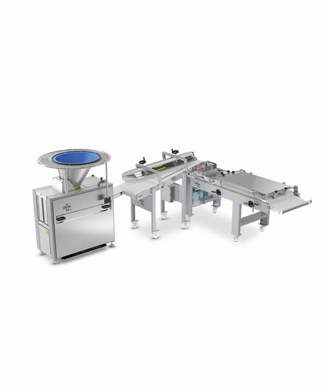 一套改进的紧凑的生产线120,可用于小型面包房现场焙烤,适用于餐包,面包和法棒的生产,性价比高。特别适用于生产不需要中间醒发的面包。整条线只需要一个工作人员即可完成全部流程操作。