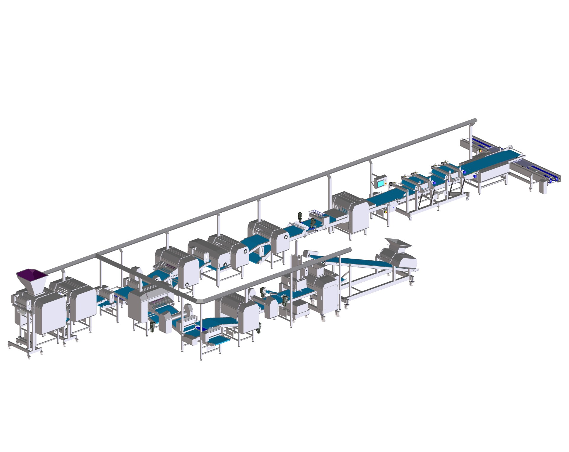双功能生产线:泡芙,起酥馅料生产。带有一个全面团供给部分,可生产每种产品。带有一些面片处理线转换一个启动/停止馅料线:自动厅同步,挡板,注馅,注馅分离,压格,剪边机,废料回收系统。